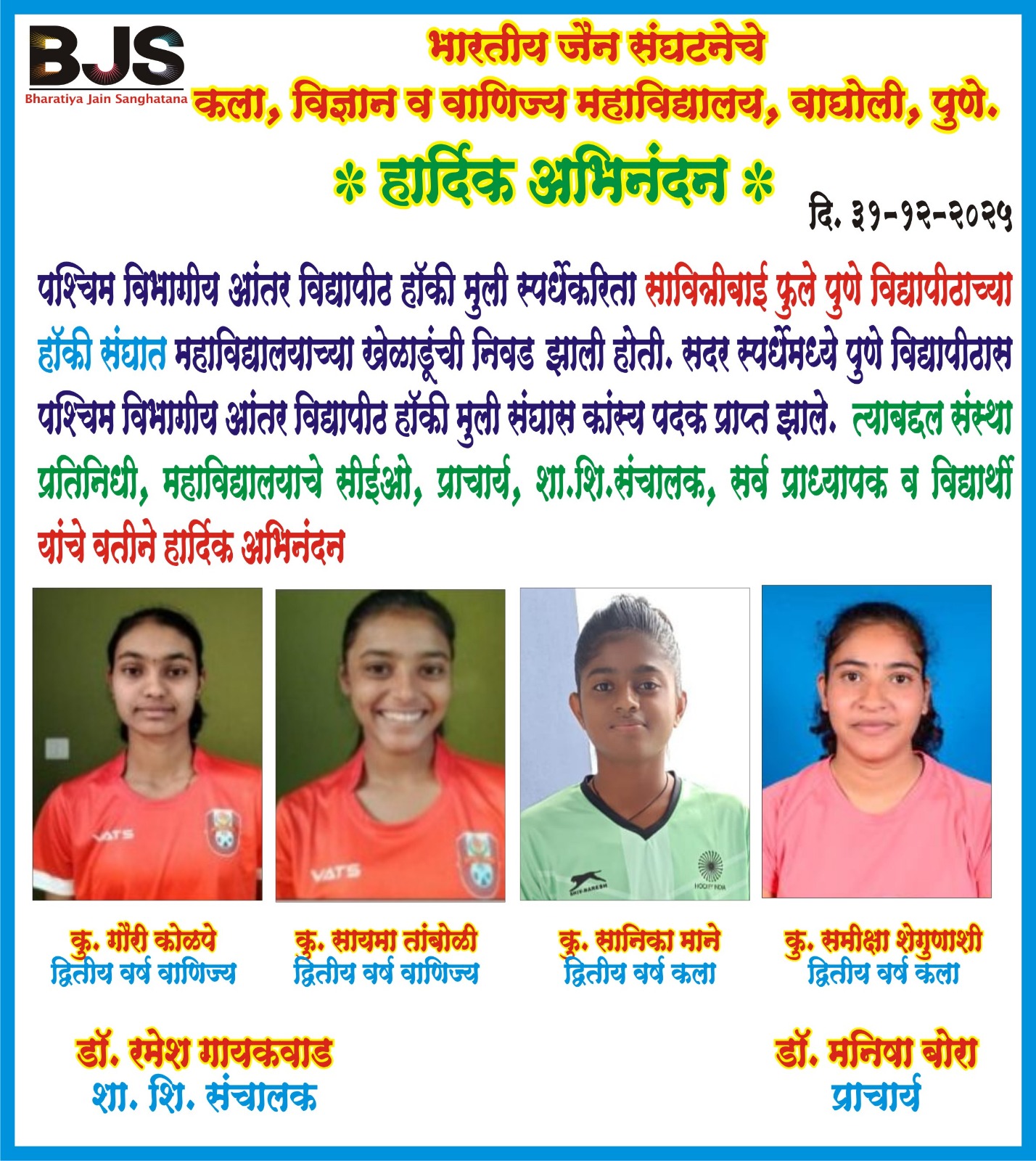 It is my great privilege and honour to welcome you to Bharatiya Jain Sanghtana’s Arts, Science and Commerce College, Wagholi, Pune—an institution that stands firmly committed to academic excellence, social responsibility and the holistic development of students.